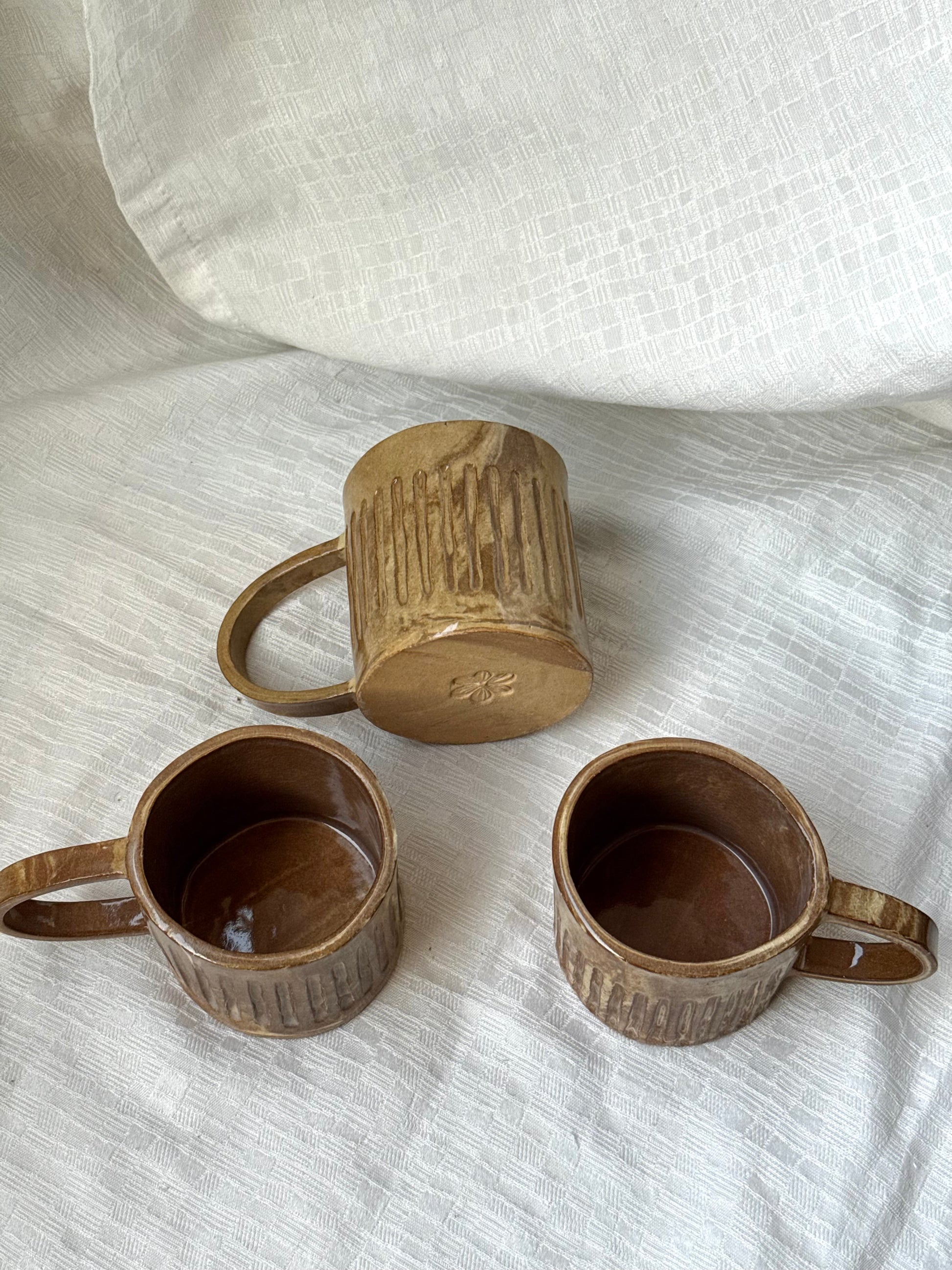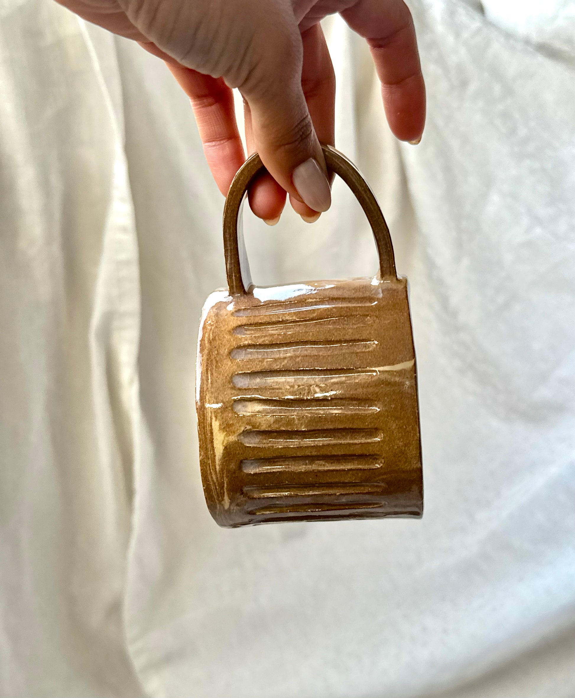 Canecas com acabamento marmorizado em tons de marrom e off white.