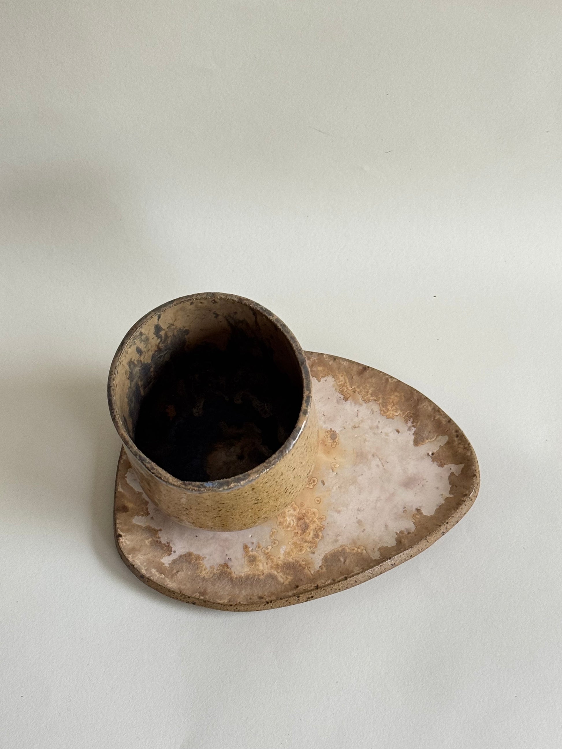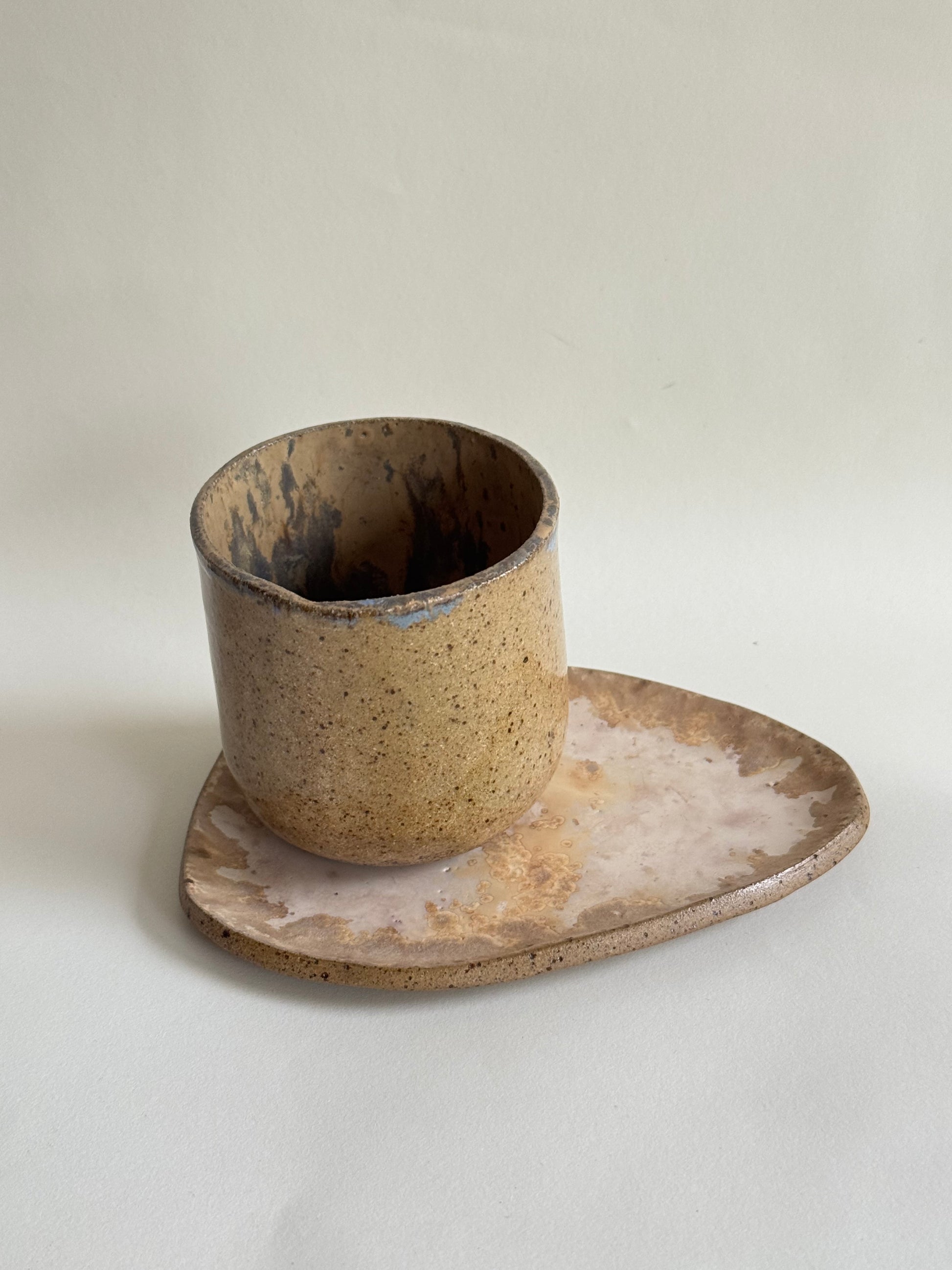 Acabamento do pires com esmalte reativo. O esmalte reativo cria efeitos únicos em cada peça, tornando-as exclusivas. Nenhuma sai igual à outra, sempre com nuances e variações especiais.