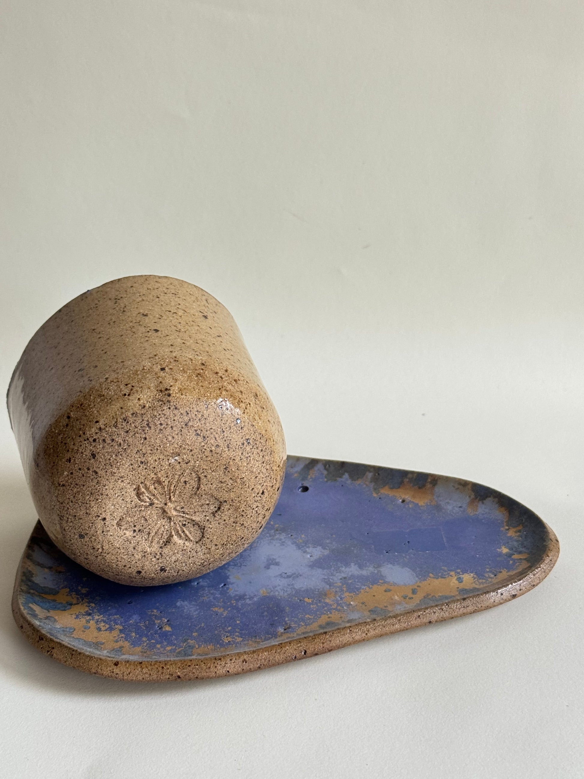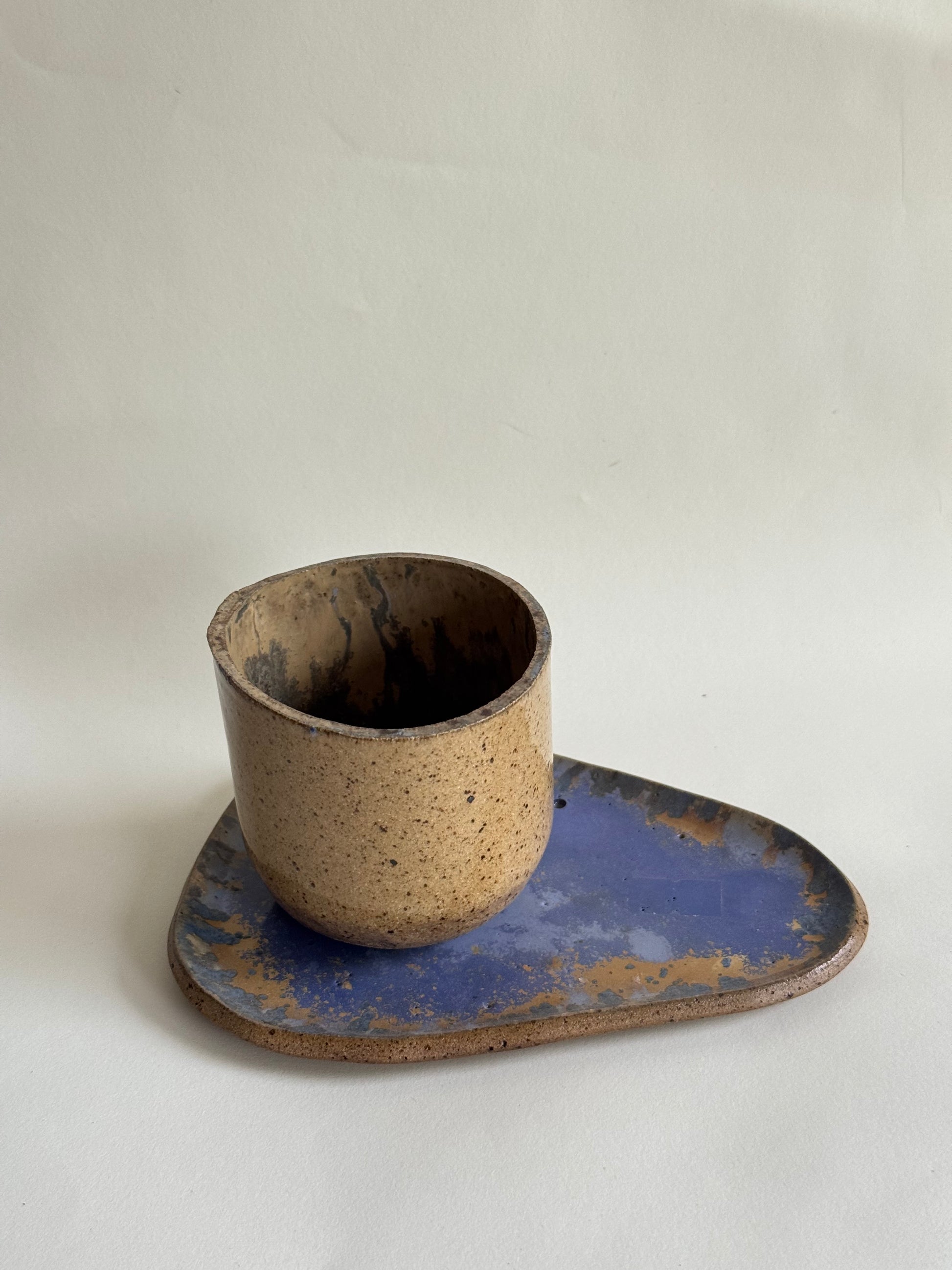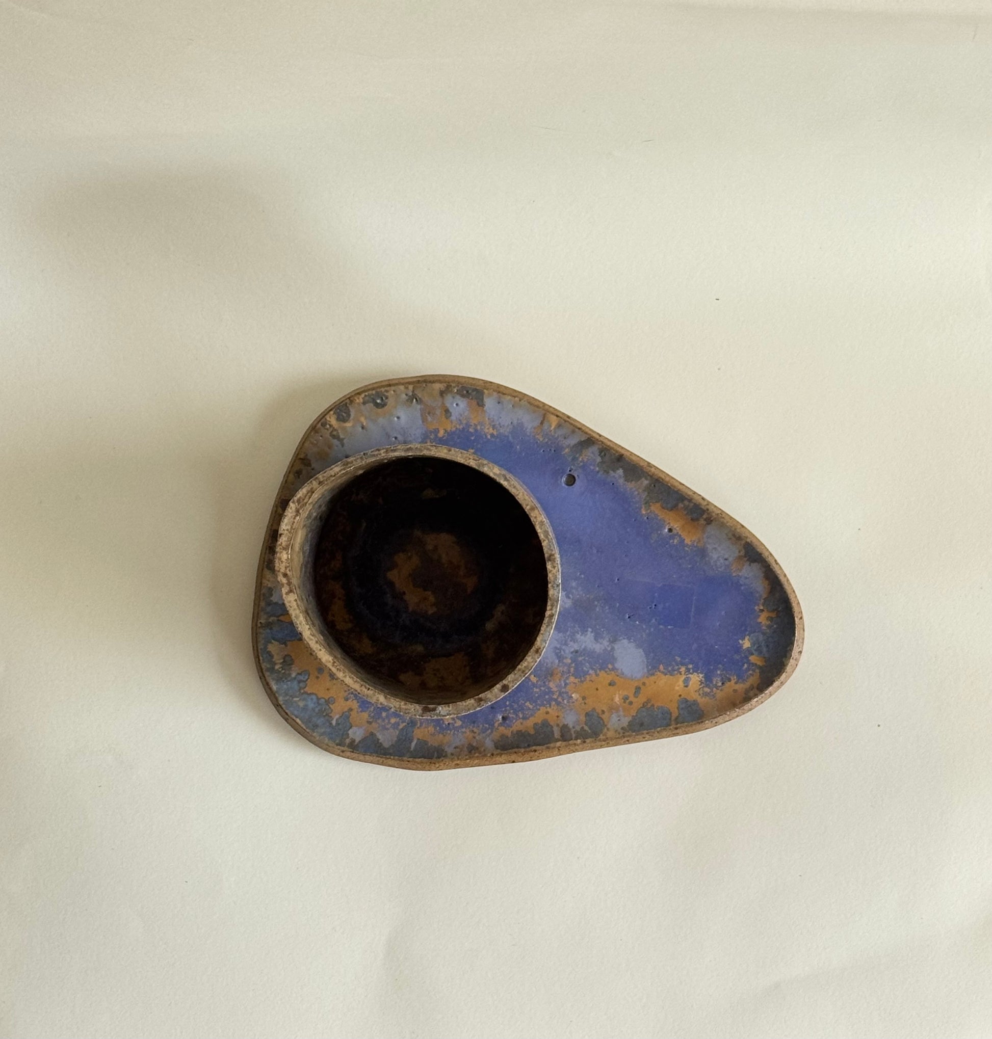 Acabamento do pires com esmalte reativo. O esmalte reativo cria efeitos únicos em cada peça, tornando-as exclusivas. Nenhuma sai igual à outra, sempre com nuances e variações especiais.